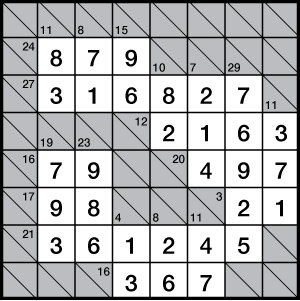 Each run of numbers must add up to the answer given in the corresponding box and no number can be in the same run twice. Readers use logic and mental arithmetic to find the answer. A challenging puzzle even at easy level – this moderate-level puzzle will take most people more than 20 minutes to complete.